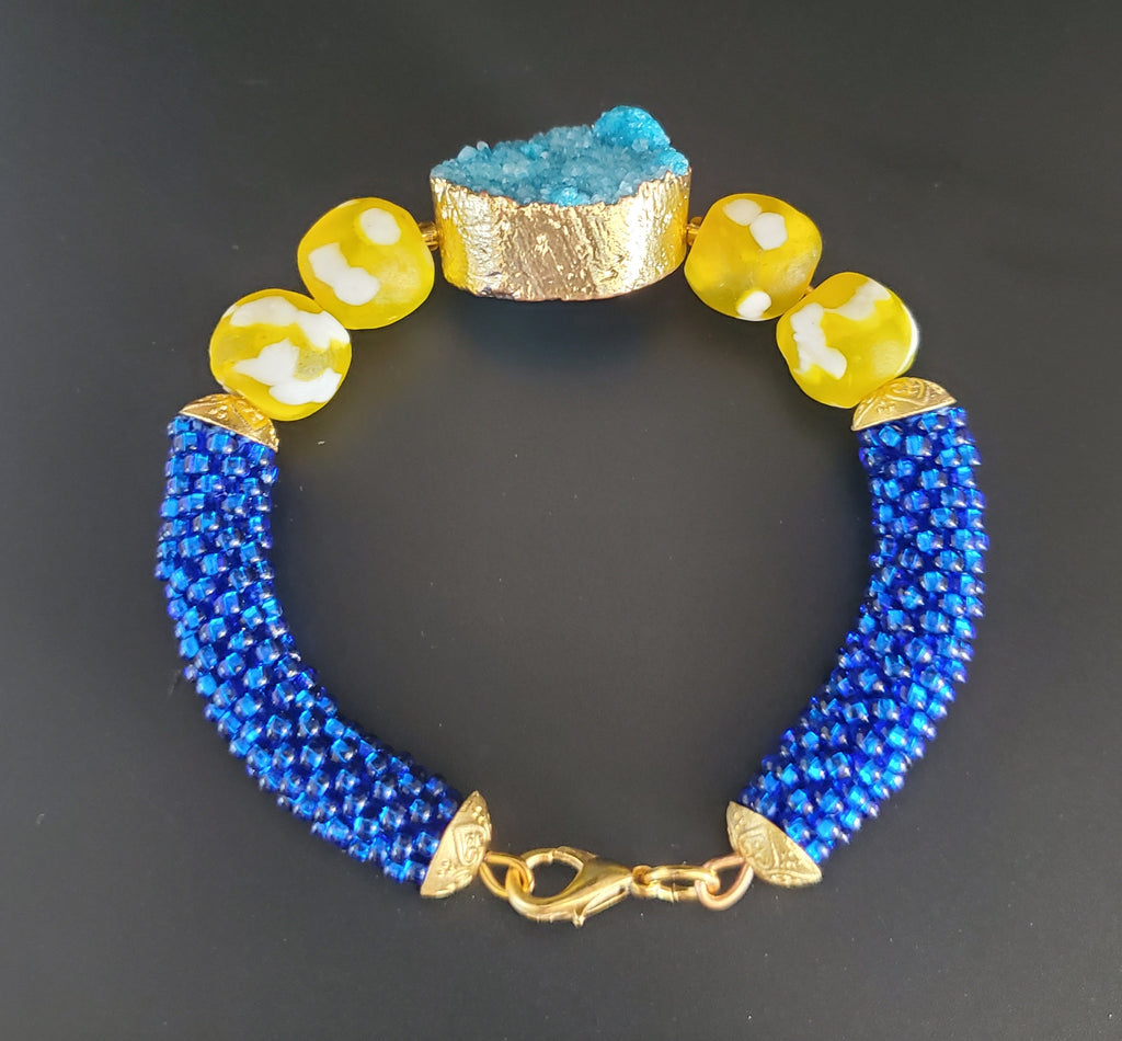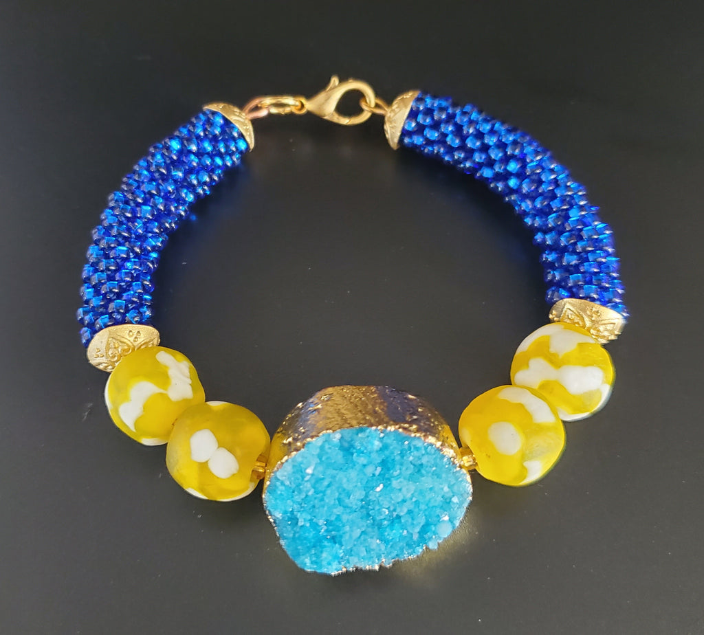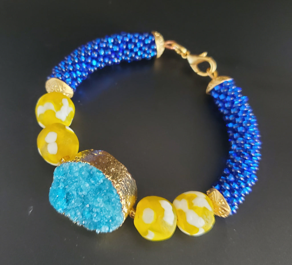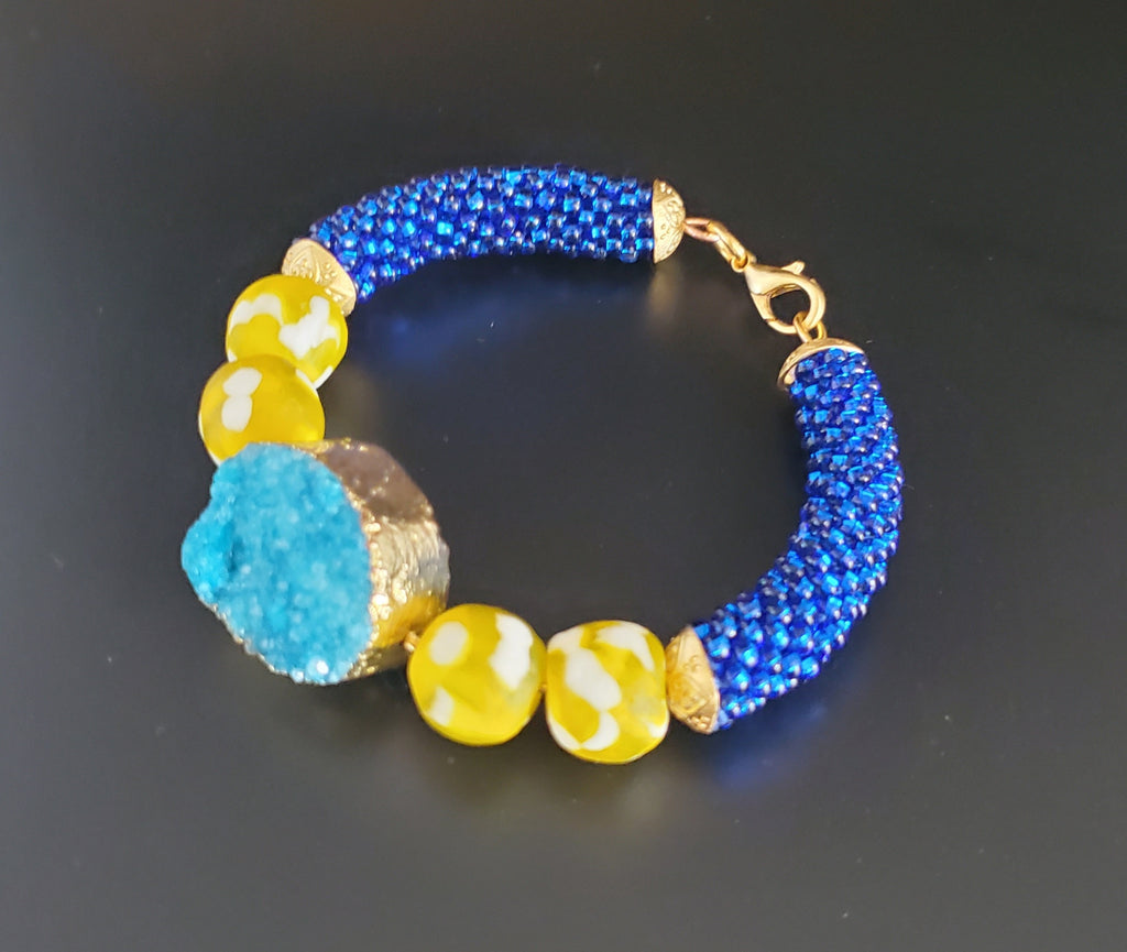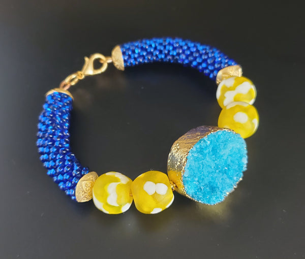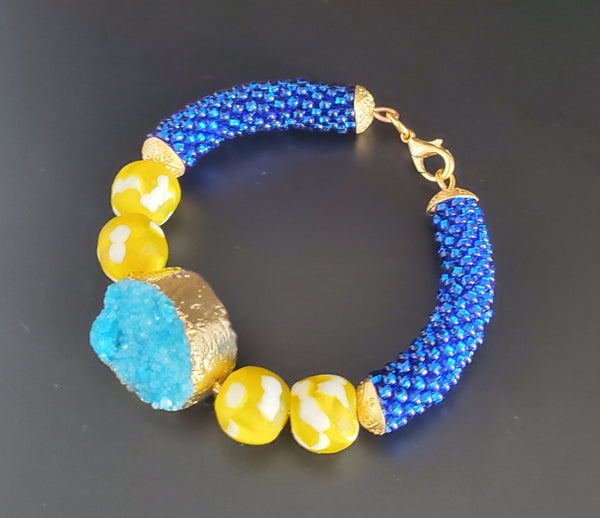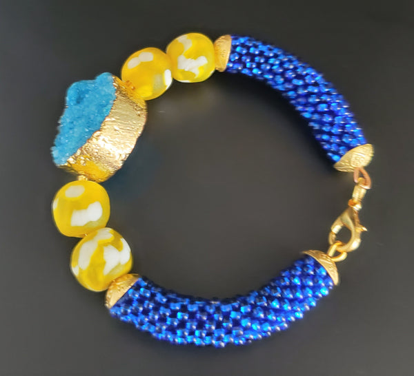 Blue Druzy-Yellow-Blue Combo Beaded Crochet Bangle