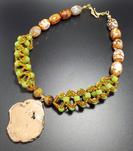 Gold Plated Druzy, Green Krobo Beads, Gold Seed Beads, Tiger Eye, Fire Agate, Brass, Woven Necklace