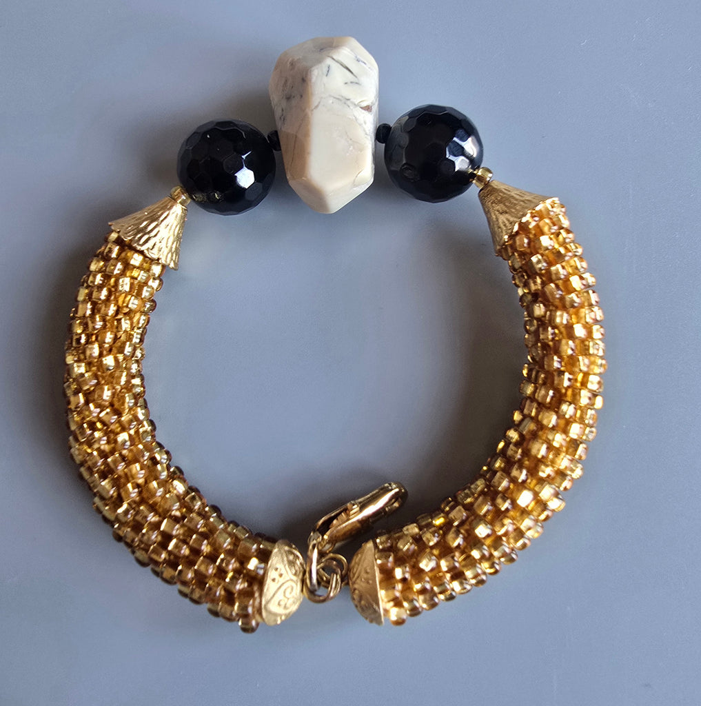 Druzy Combo Beaded Crochet Bangle - Gold/Black/Cream