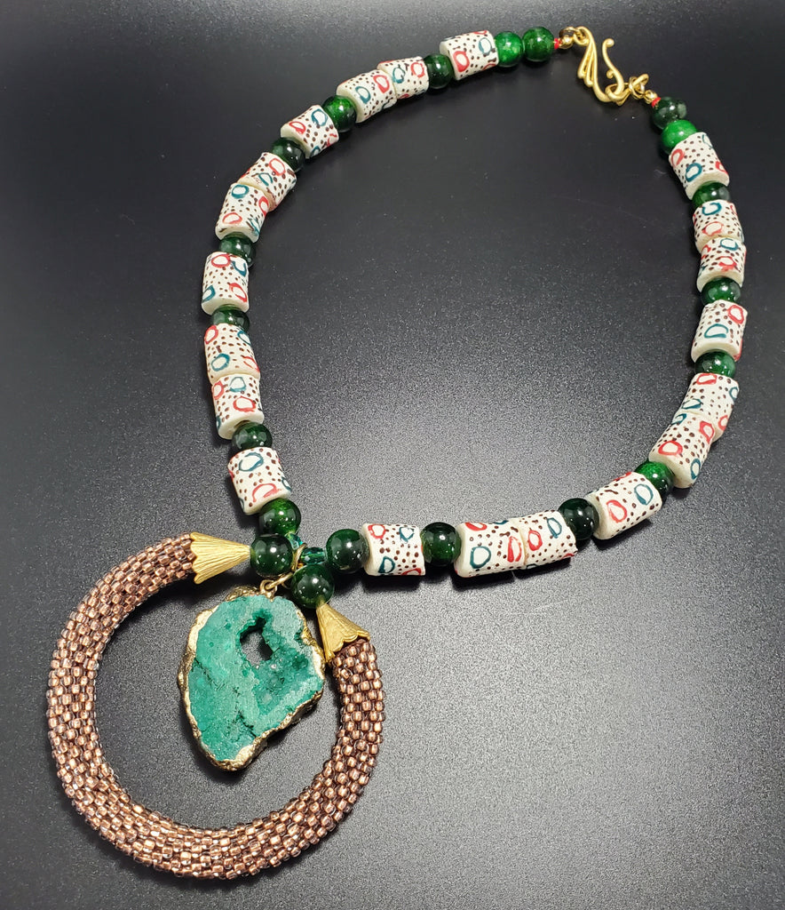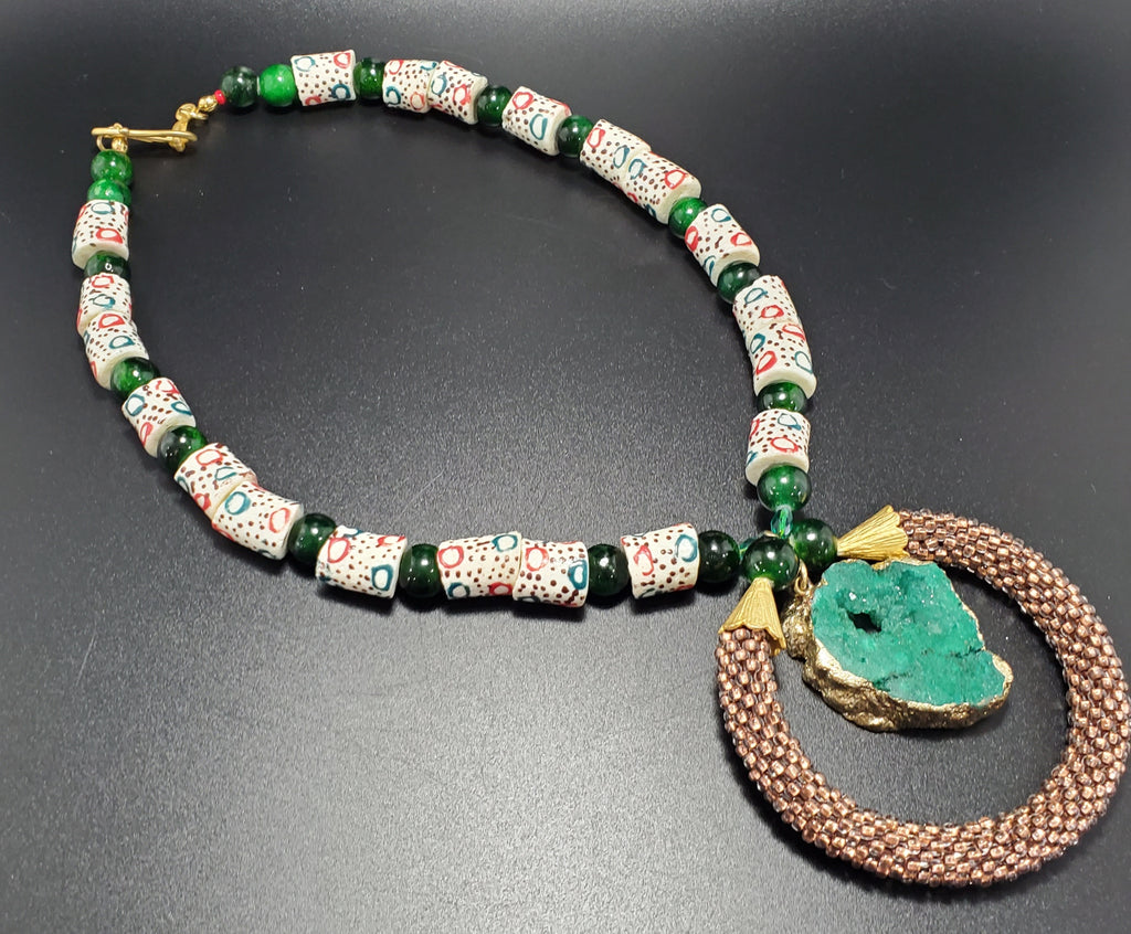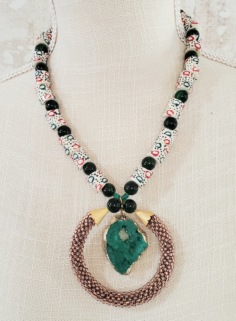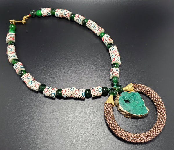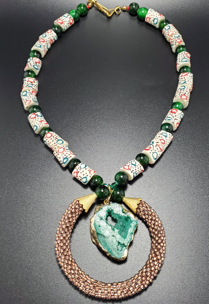 Gold Plt Green Druzy, Grn/Red/Wht Krobo Beads, Quartzite, Czech Seed, Crochet Pendant Necklace