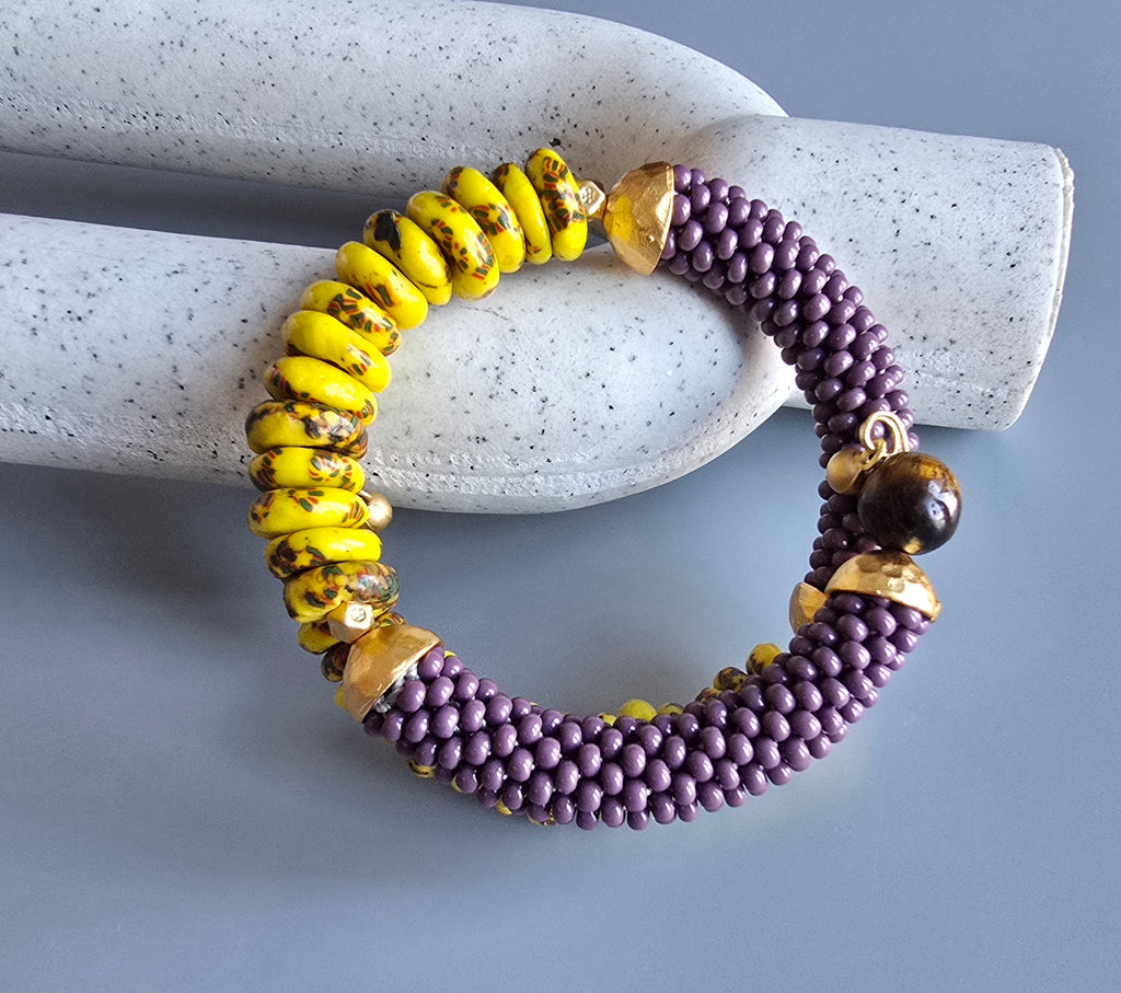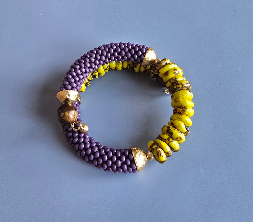 Krobo Combo Beaded Crochet Bangle - Yellow/Purple