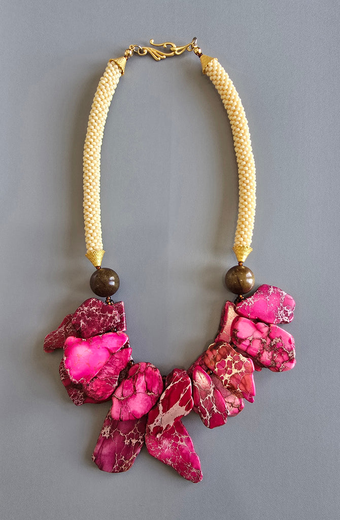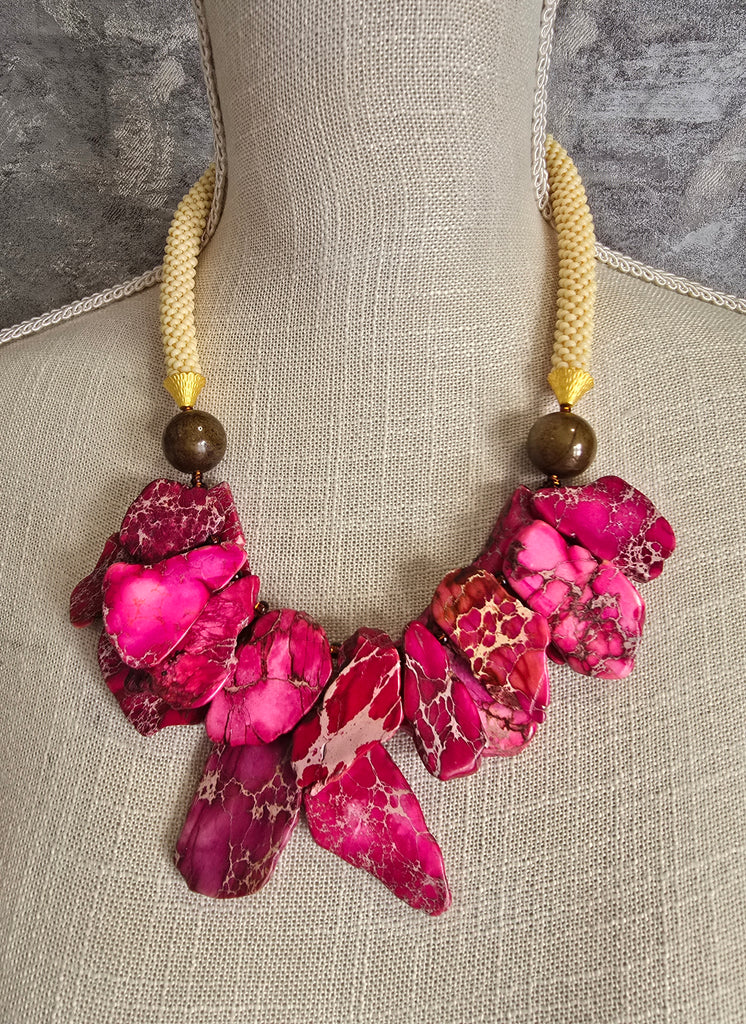 Tiny Czech seed beads are hand crocheted one bead at a time, with a mix of agate beads, jasper beads and gold plated brass finishing.