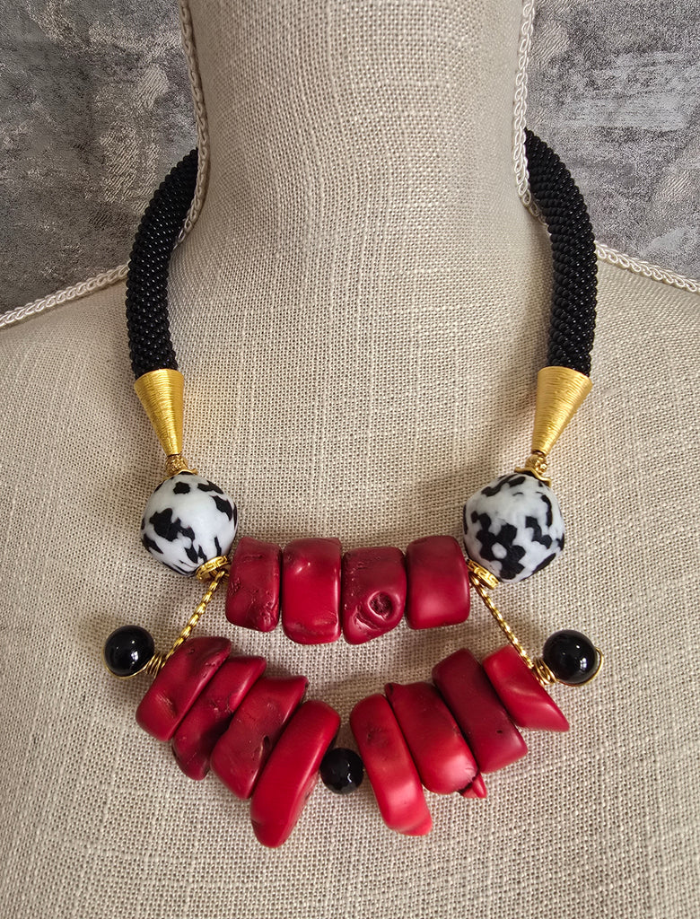 Tiny Czech seed beads are hand crocheted one bead at a time, with a mix of onyx beads, Krobo beads, coral beads, 22K gold plated brass and gold plated brass finishing.